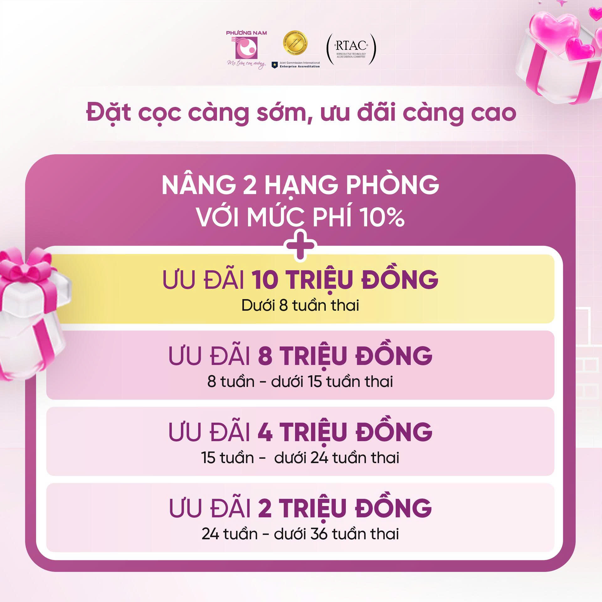 Tại Bệnh viện Phương Nam, mức ưu đãi được áp dụng trực tiếp vào chi phí gói sinh, tương ứng với thời điểm mẹ đặt cọc: