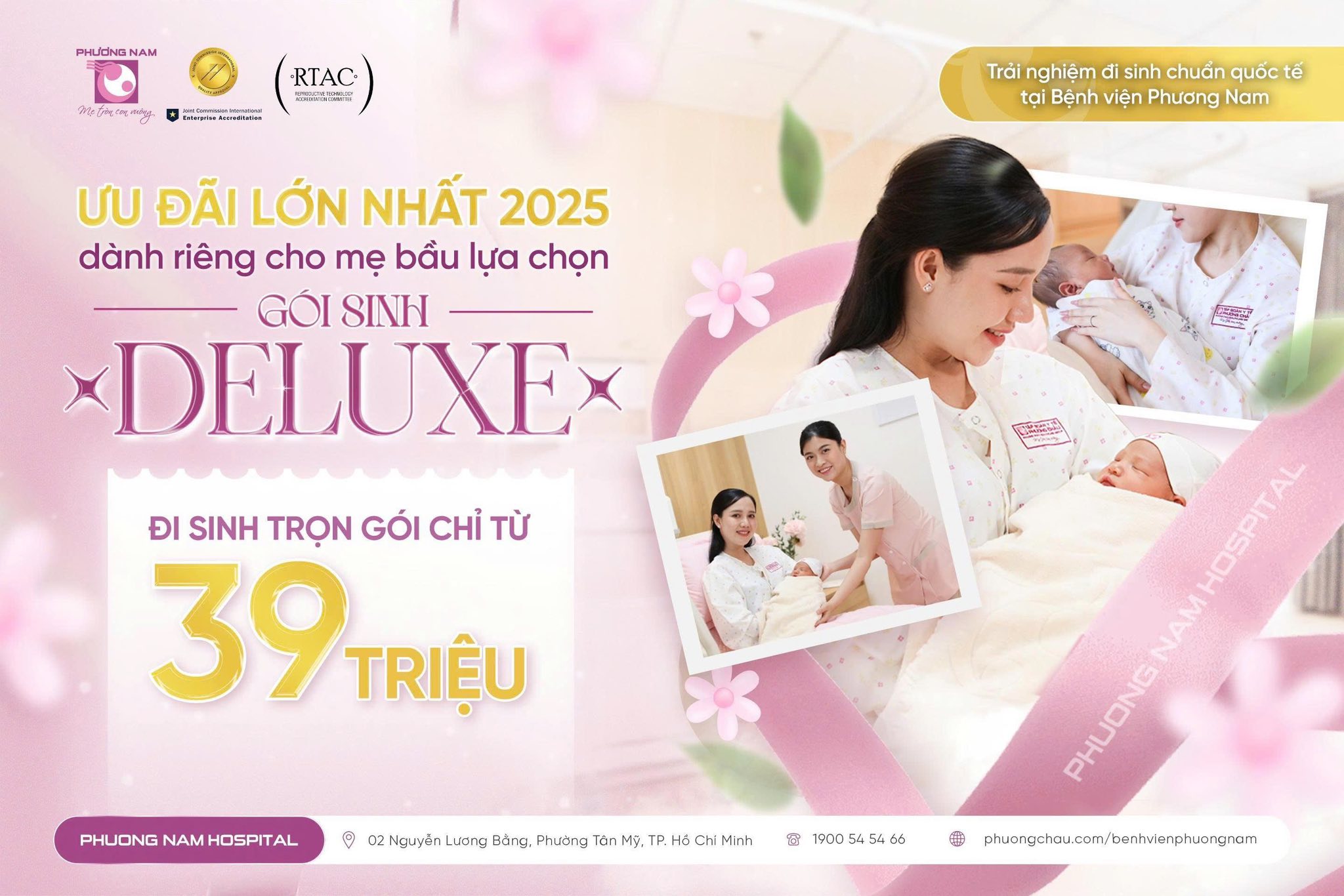 Gói sinh Deluxe tại Bệnh viện Phương Nam được thiết kế để mang đến trải nghiệm sinh an toàn, tiện nghi và đẳng cấp. Với sự hỗ trợ tận tình của đội ngũ y bác sĩ giàu kinh nghiệm và quy trình chuẩn quốc tế JCI, mẹ bầu hoàn toàn có thể yên tâm tận hưởng những giờ phút đầu tiên bên con yêu.