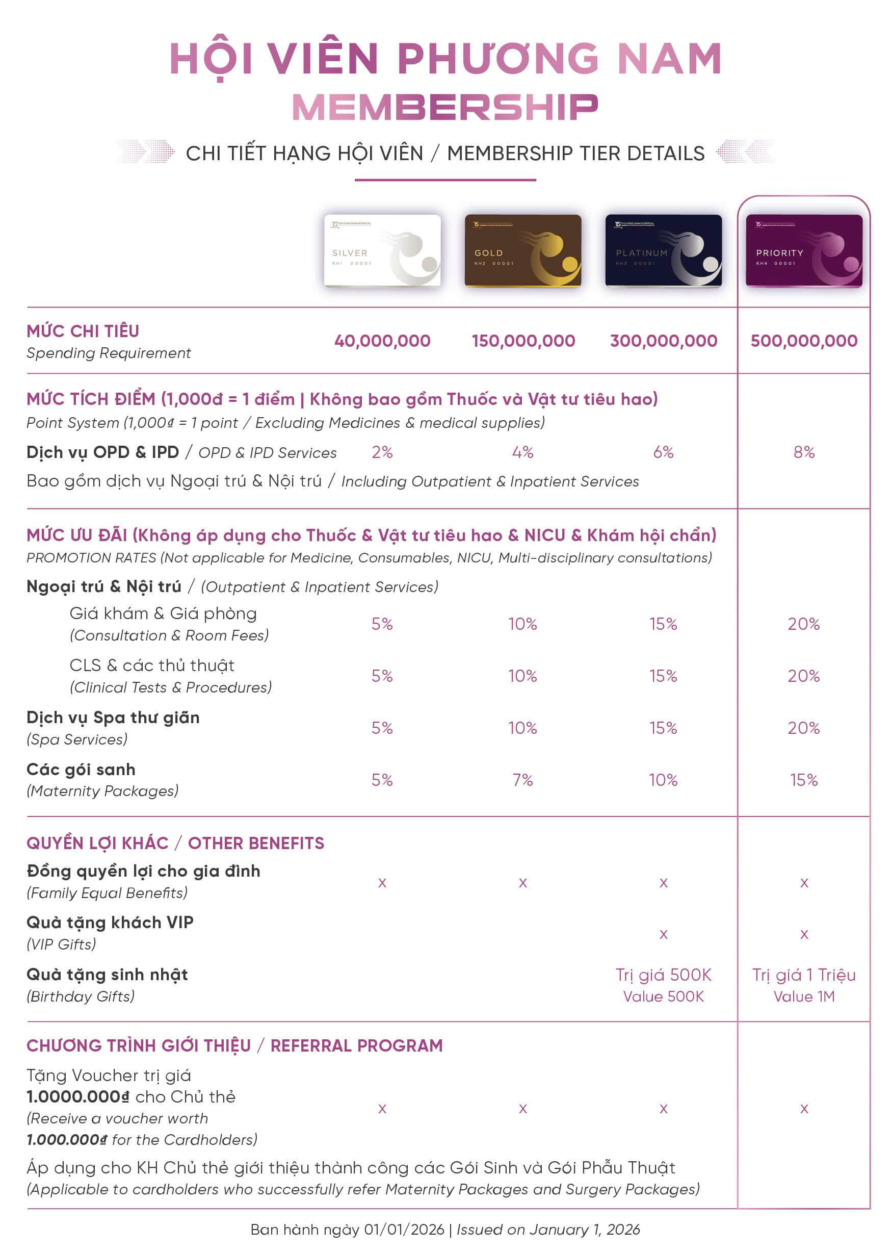 Chương trình thẻ thành viên của Bệnh viện Phương Nam cung cấp những quyền lợi ưu đãi tối ưu nhất cho Hội viên và cả người thân trong gia đình. Áp dụng tất cả các chuyên khoa của Bệnh viện: Sản - Phụ khoa, Nhi Khoa, IVF, Nam Khoa, Đa Khoa, Thẩm mỹ,...