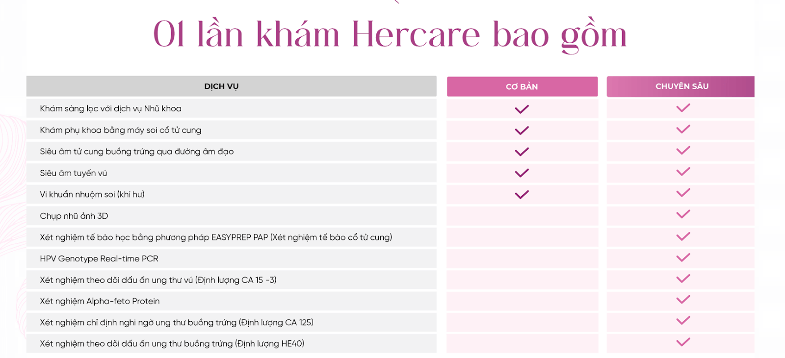 Với HERCARE, bạn được tầm soát sức khỏe định kỳ, và theo dõi liên tục theo lộ trình cá nhân hóa trong thời gian lâu dài, đảm bảo mọi vấn đề sức khỏe đều được phát hiện và xử lý kịp thời.
