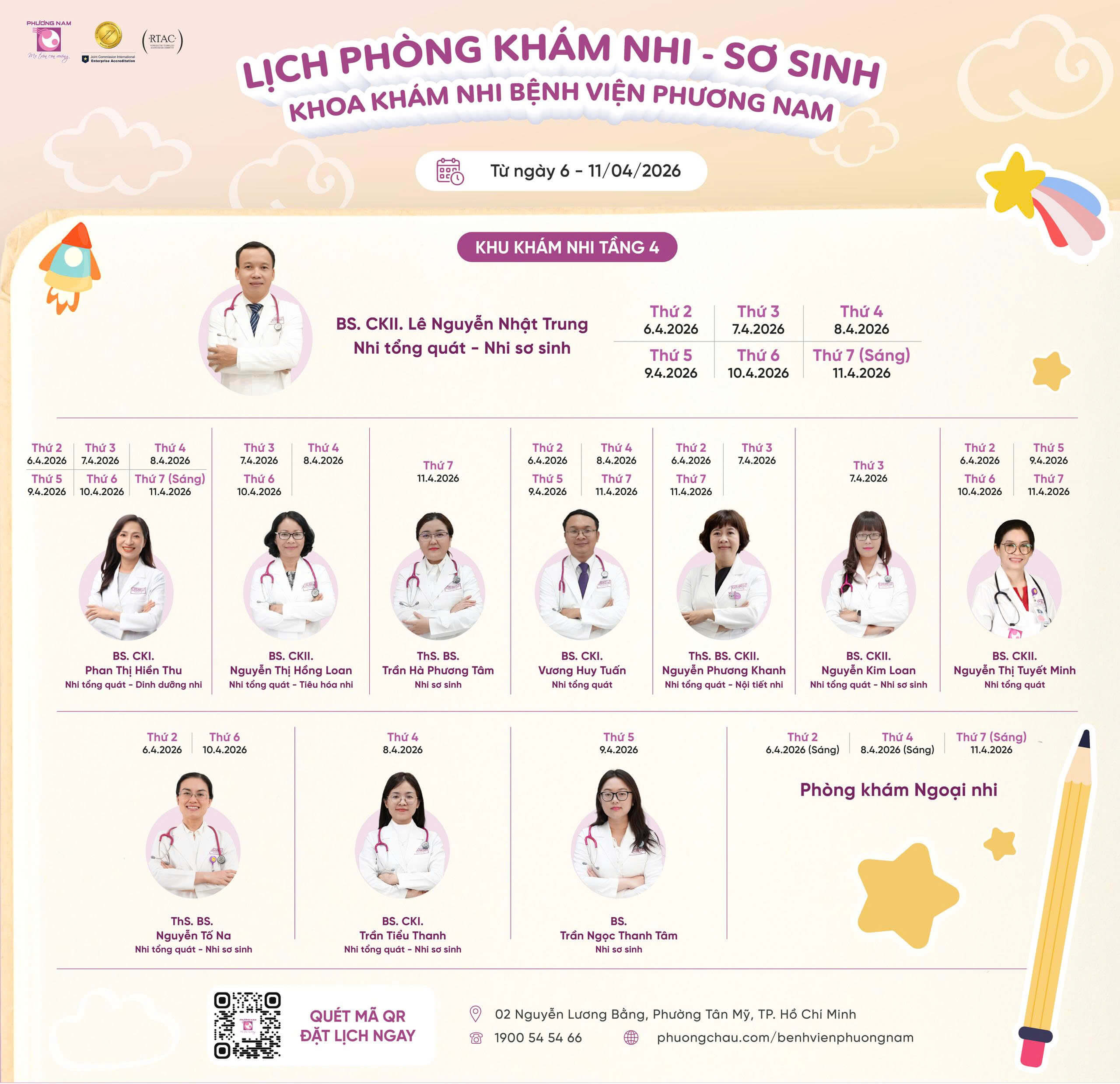 Nhằm hỗ trợ Quý khách chủ động trong việc sắp xếp thời gian thăm khám, Khoa Sản- Phụ-Nhi khoa Phương Nam xin thông báo lịch khám bác sĩ trong tuần từ ngày 06/04 - 12/04/2026