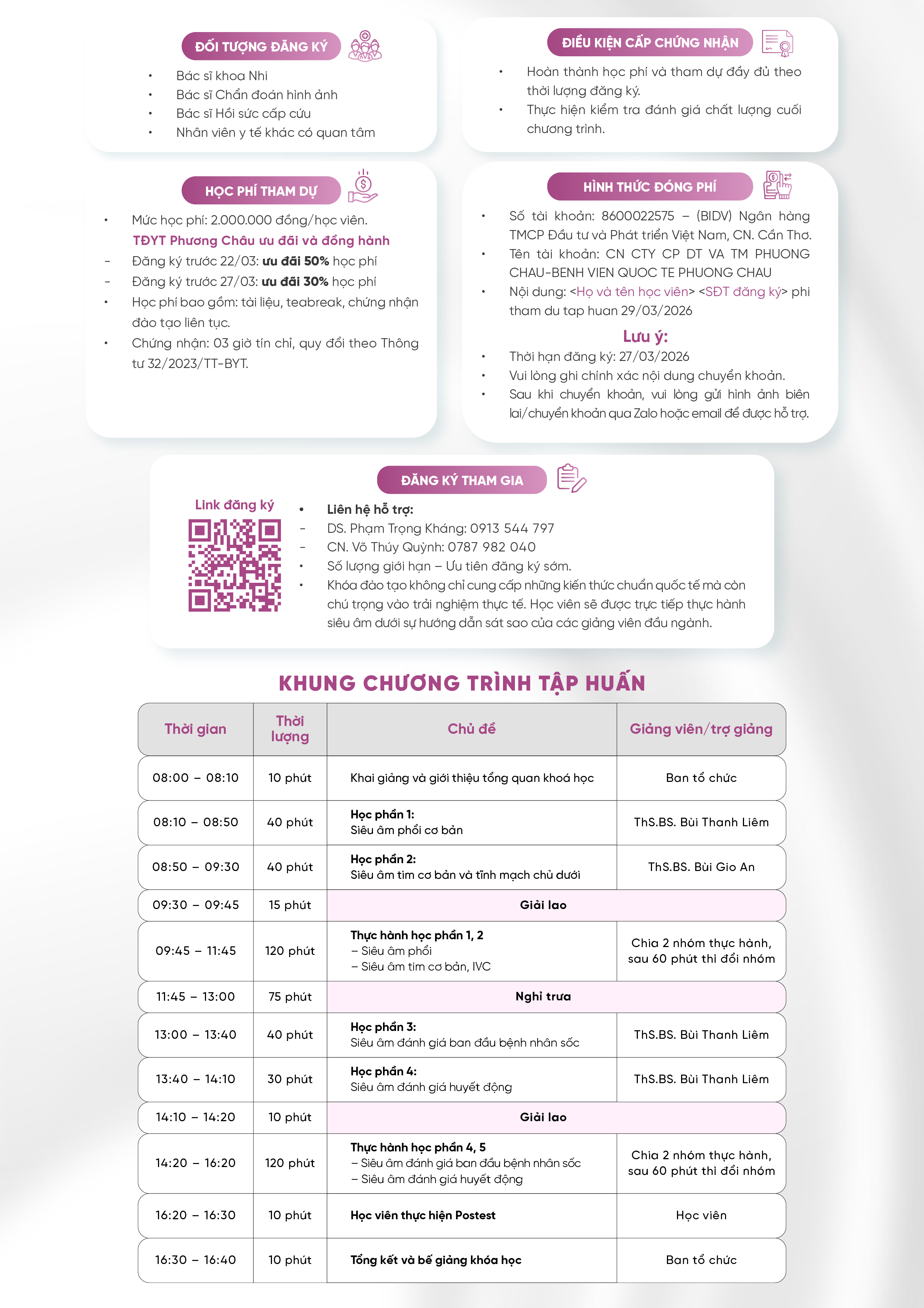 Khóa học được thiết kế nhằm chuẩn hóa và nâng cao năng lực sử dụng siêu âm tại giường trong thực hành lâm sàng. Thông qua chương trình đào tạo, học viên sẽ được trang bị cả kiến thức lý thuyết và kỹ năng thực hành cần thiết để ứng dụng siêu âm hiệu quả trong việc đánh giá và xử trí bệnh nhi bị sốc.