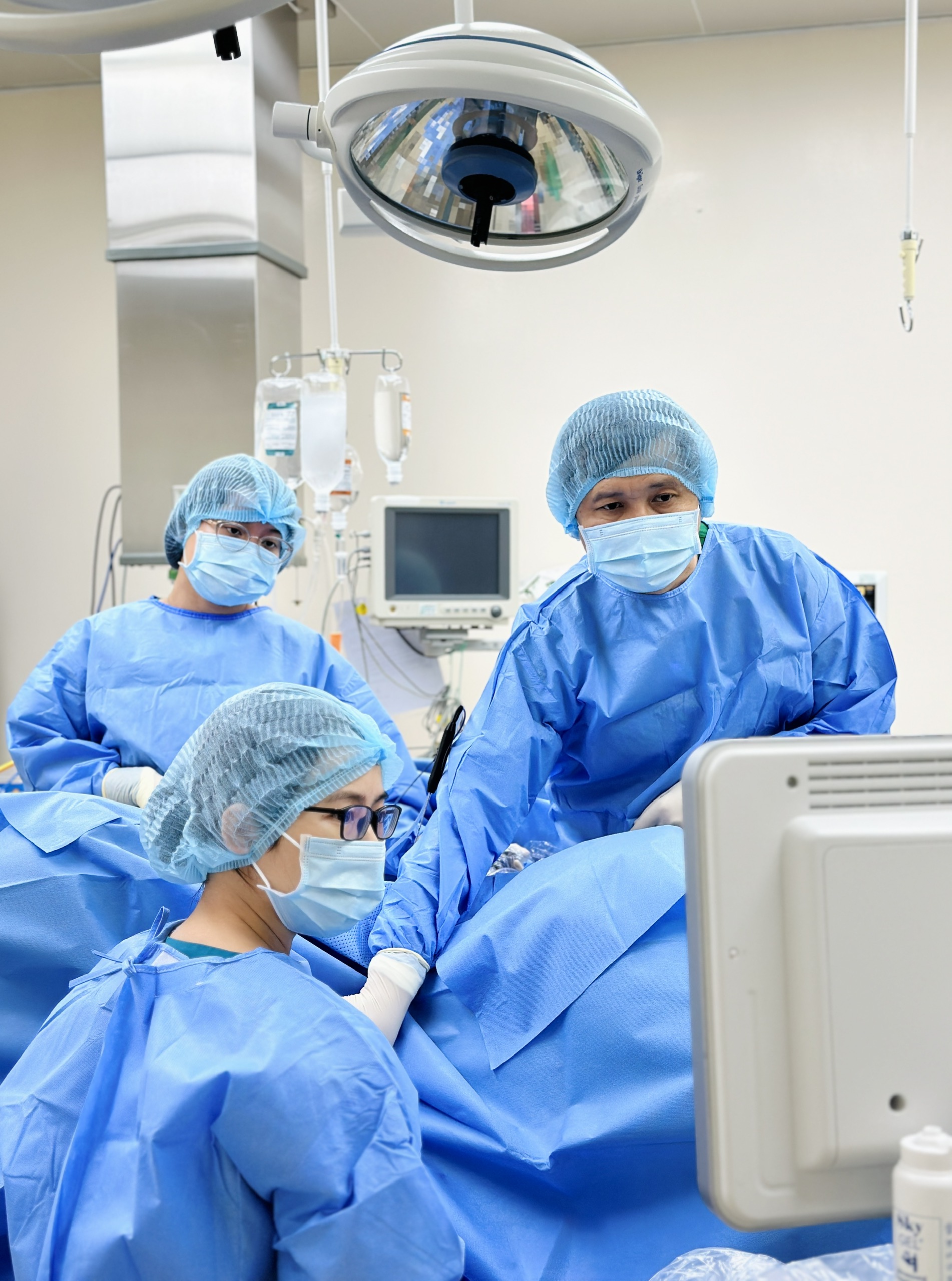 Hình ảnh ê-kíp Phụ khoa Phương Châu thực hiện phẫu thuật nội soi ổ bụng đốt sóng cao tần điều trị adenomyosis cho bệnh nhân.