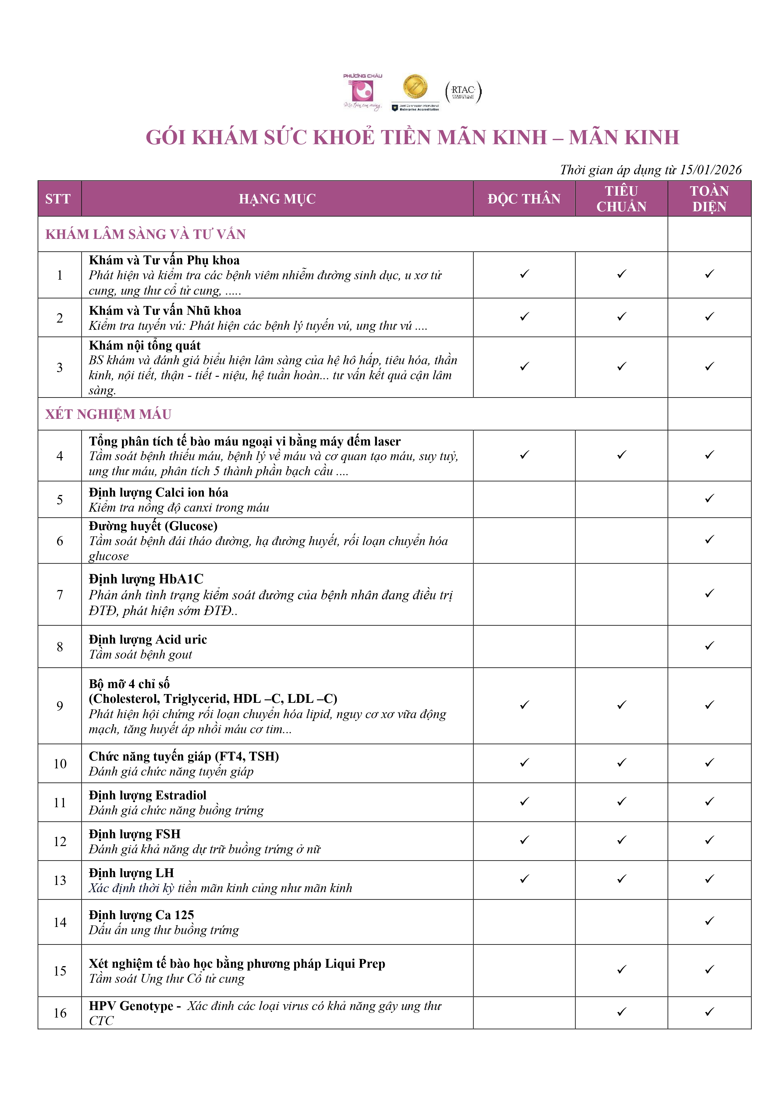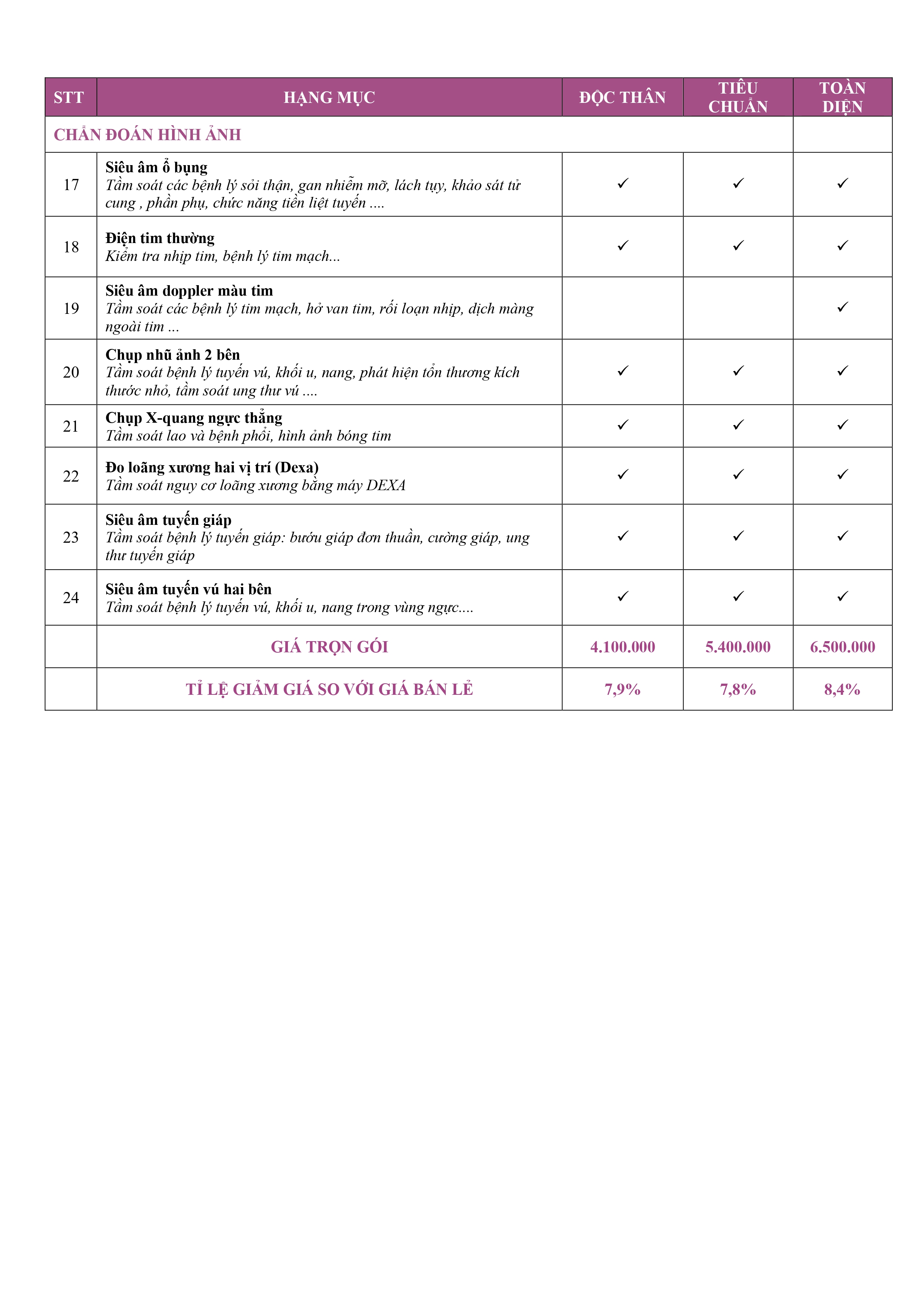 HẠNG MỤC CÁC GÓI KHÁM