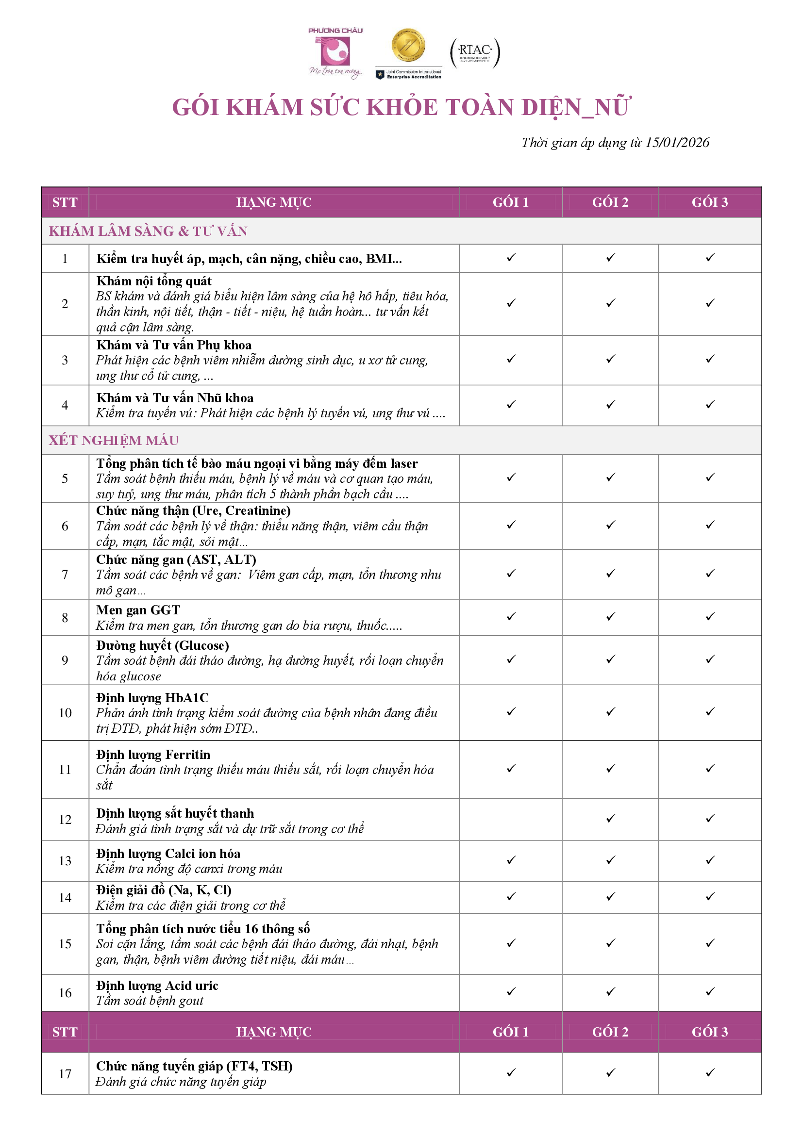 Do vậy, Phương Châu đã thiết kế nên Gói khám sức khỏe toàn diện dành cho phụ nữ từ sự kết hợp giữa Gói tầm soát sức khỏe tổng quát và Gói tầm soát ung thư phụ khoa với mong muốn mang đến những biện pháp phòng tránh cũng như điều trị các căn bệnh nguy hiểm. Đồng thời giúp kiểm tra và đánh giá một cách tổng quan nhất cho cơ thể của người phụ nữ thông qua: