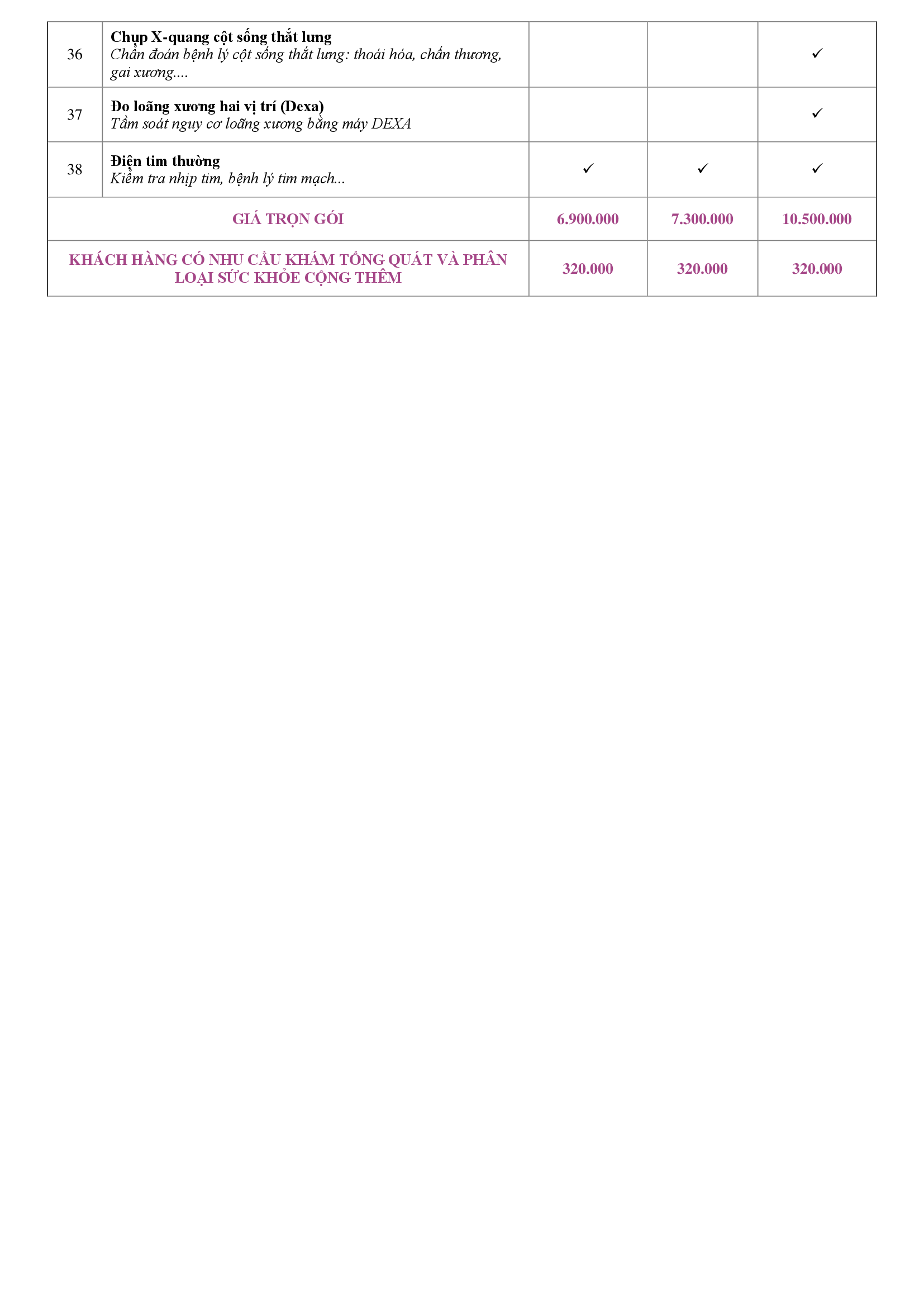 - Khám đầy đủ các chuyên khoa cơ bản, tầm soát về các bệnh lý tim mạch, huyết áp, đái tháo đường, rối loạn chuyển hóa các chỉ số trong cơ thể, viêm gan B & C, tuyến giáp...