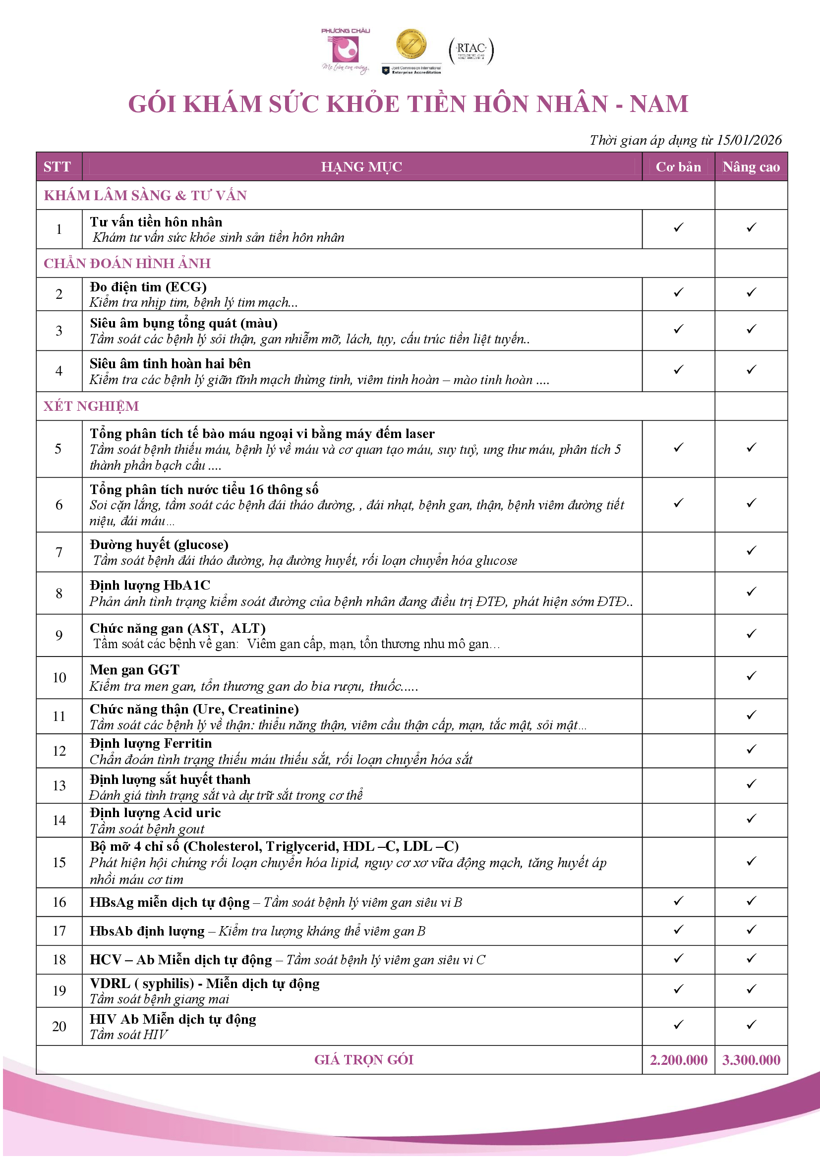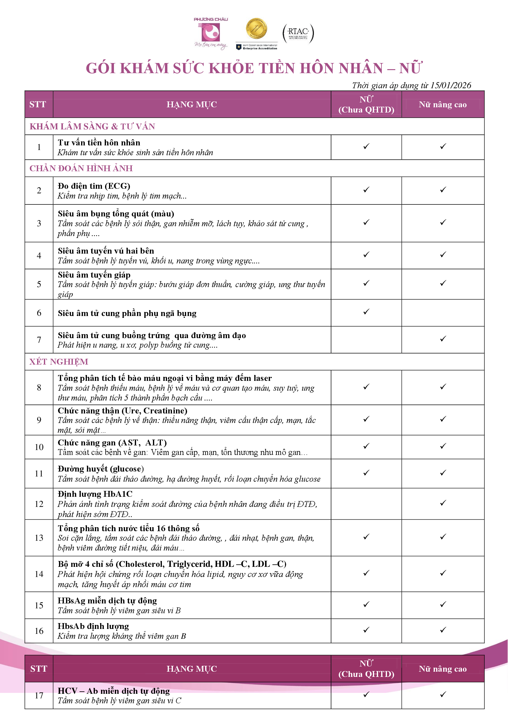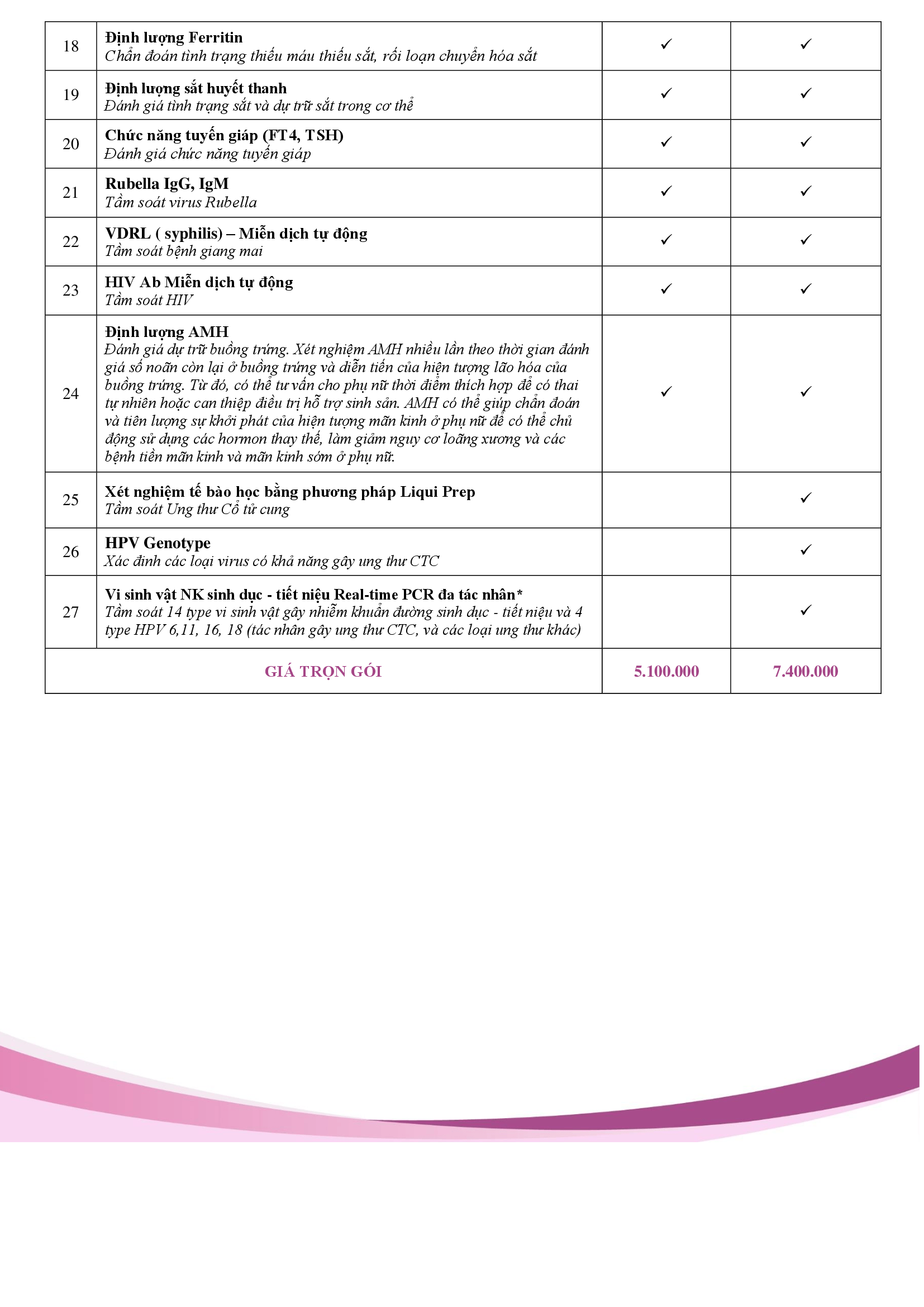 - Được thiết kế riêng phù hợp với từng đối tượng (nam, nữ đã hoặc chưa QHTD) mà không bỏ sót các hạng mục khám cần thiết.