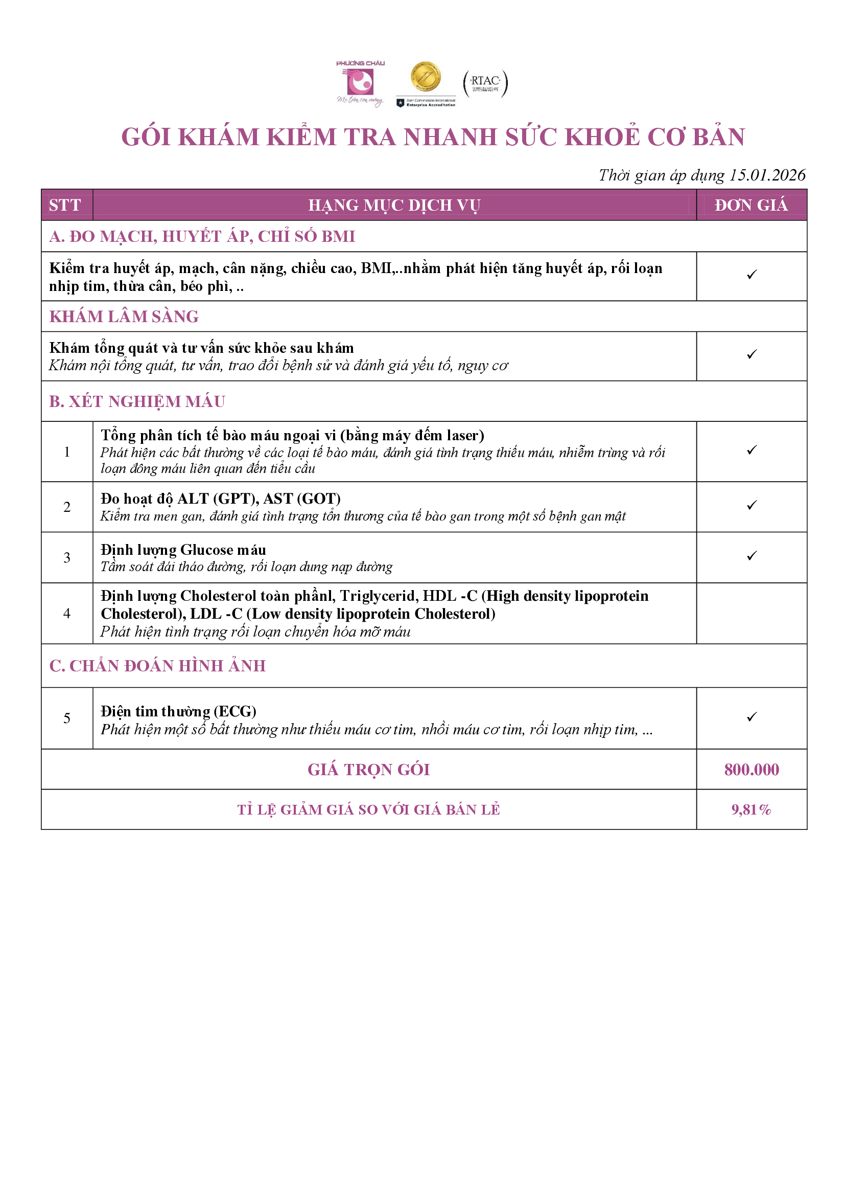 Gói kiểm tra nhanh sức khỏe cơ bản