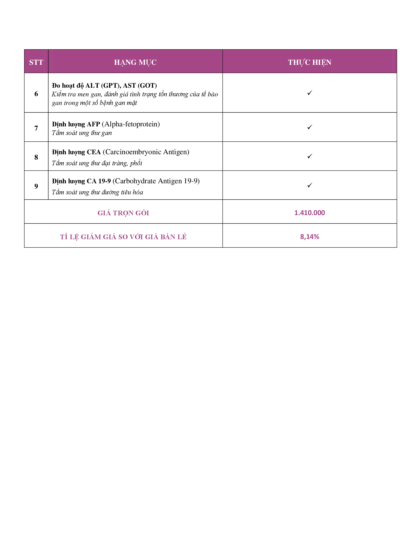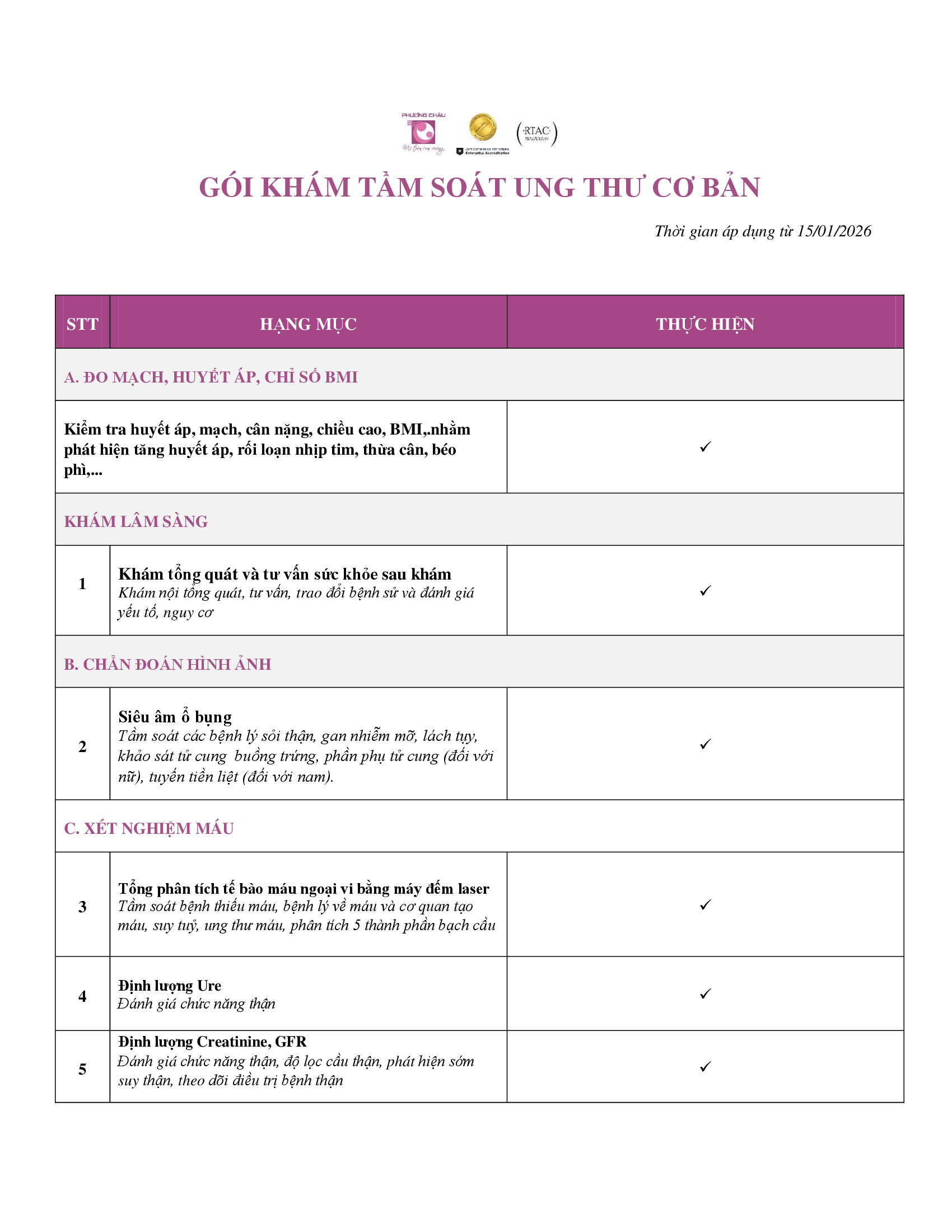 HẠNG MỤC CÁC GÓI KHÁM