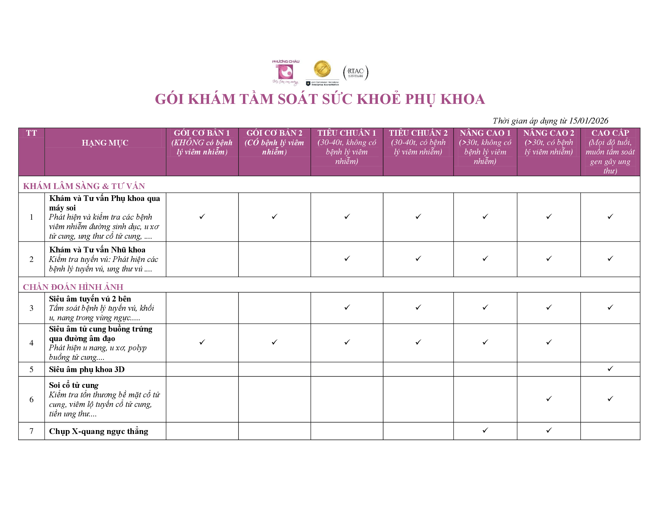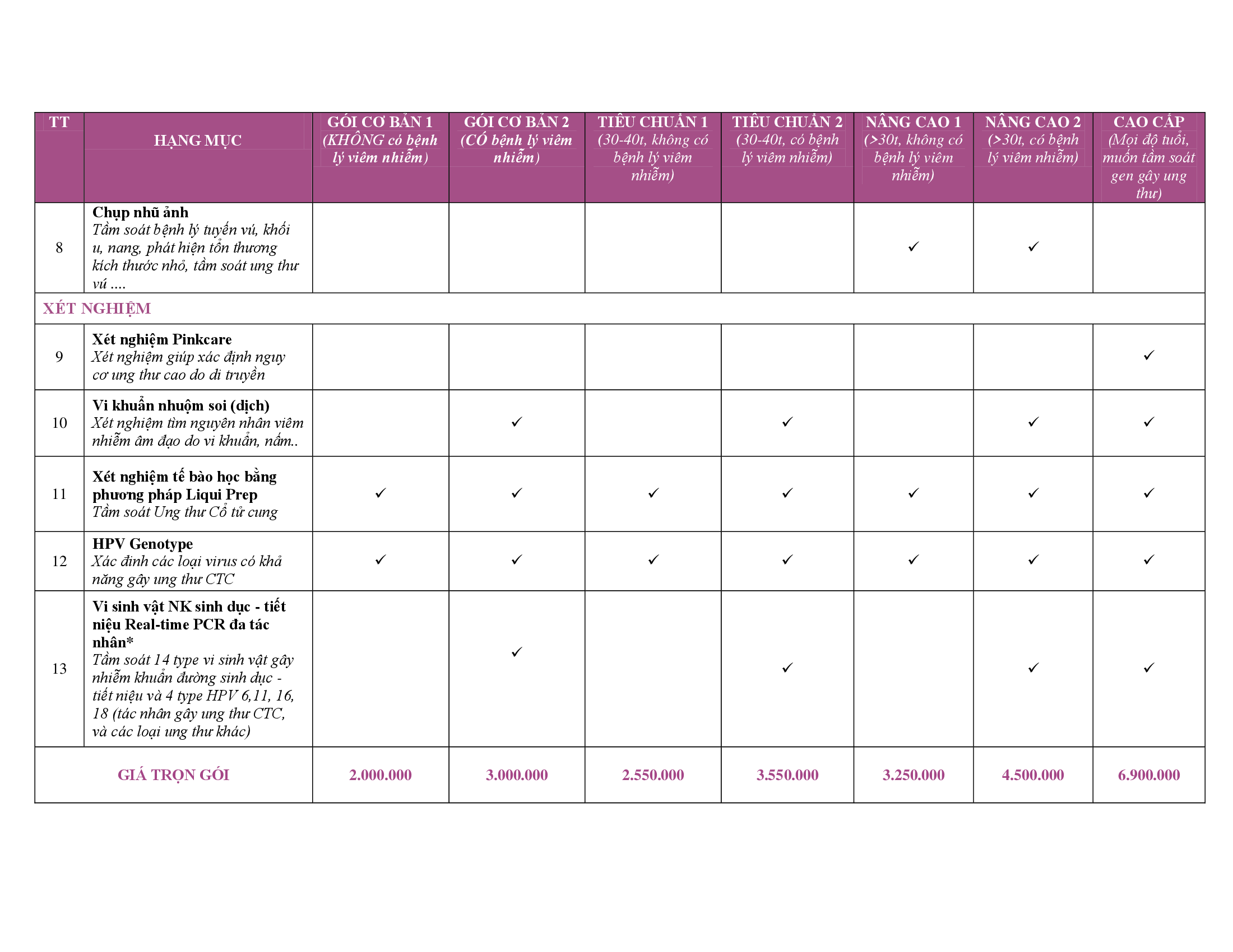 HẠNG MỤC CÁC GÓI KHÁM