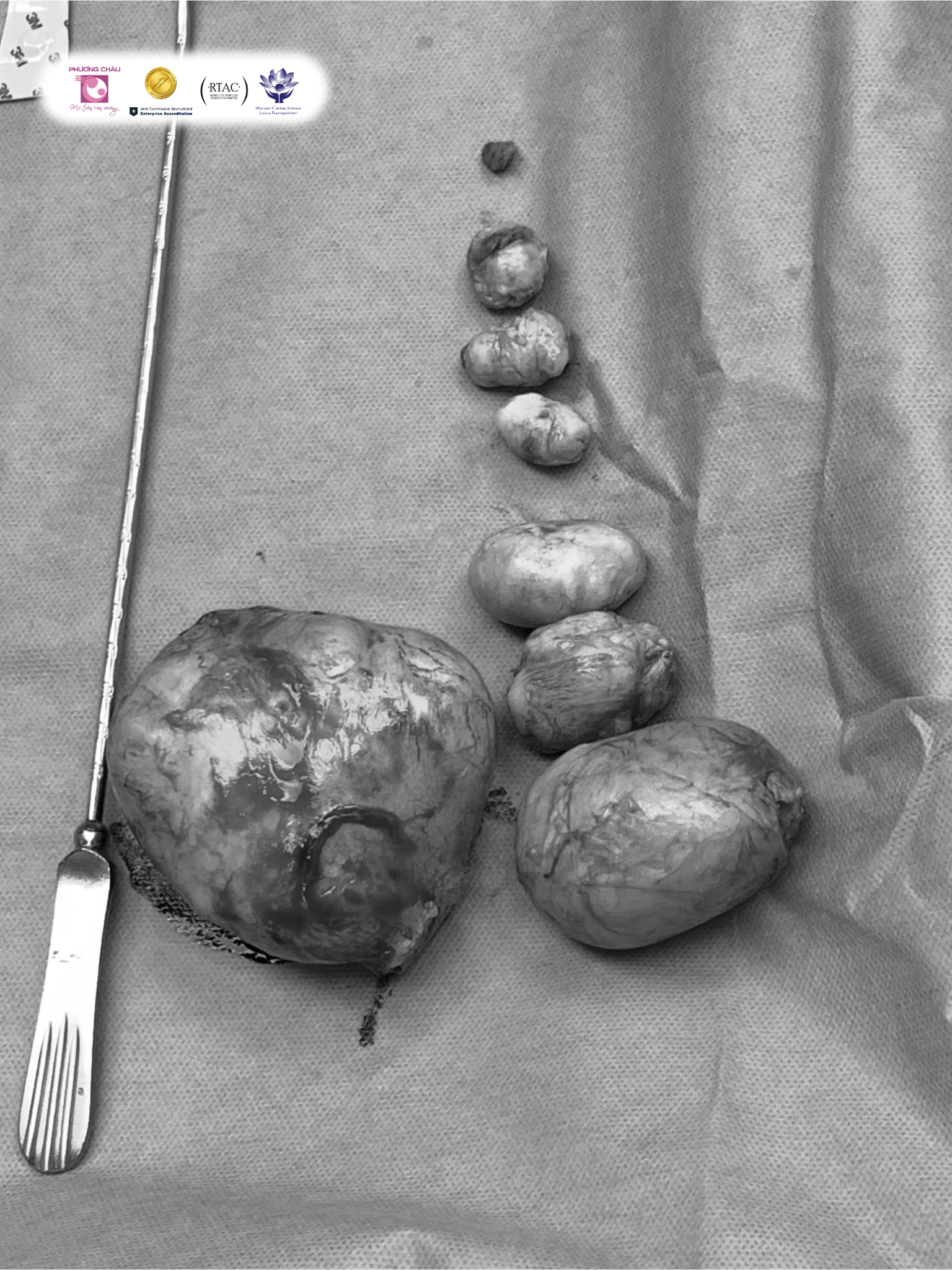 8 khối u được bóc tách hoàn toàn sau cuộc mổ lấy thai “nghẹt thở” tại BVQT Phương Châu