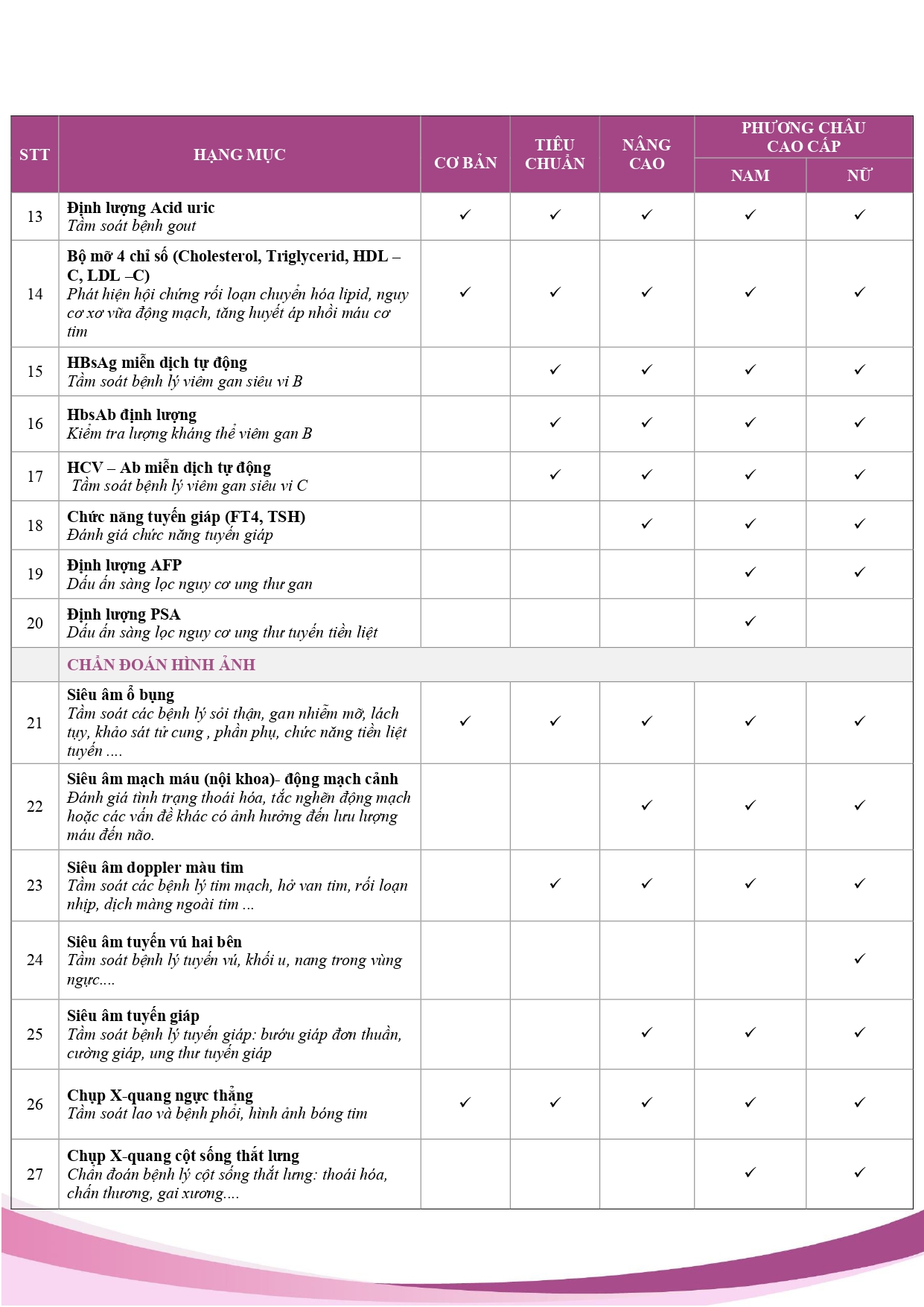 3. Gói Phương Châu Cao Cấp: Gói dịch vụ có sự phân chia (nam, nữ) nhằm phù hợp với việc tầm soát bệnh lý liên quan đến giới tính, được khuyến cáo dành cho người từ 40 tuổi trở lên. Tầm soát các bệnh lý còn trong giai đoạn tiềm ẩn, các loại ung thư phổ biến (ung thư vú, tiền liệt tuyến, cổ tử cung, đại tràng…) và các yếu tố suy thoái (như: xương khớp, loãng xương…) thường xuất hiện ở những người cao tuổi.