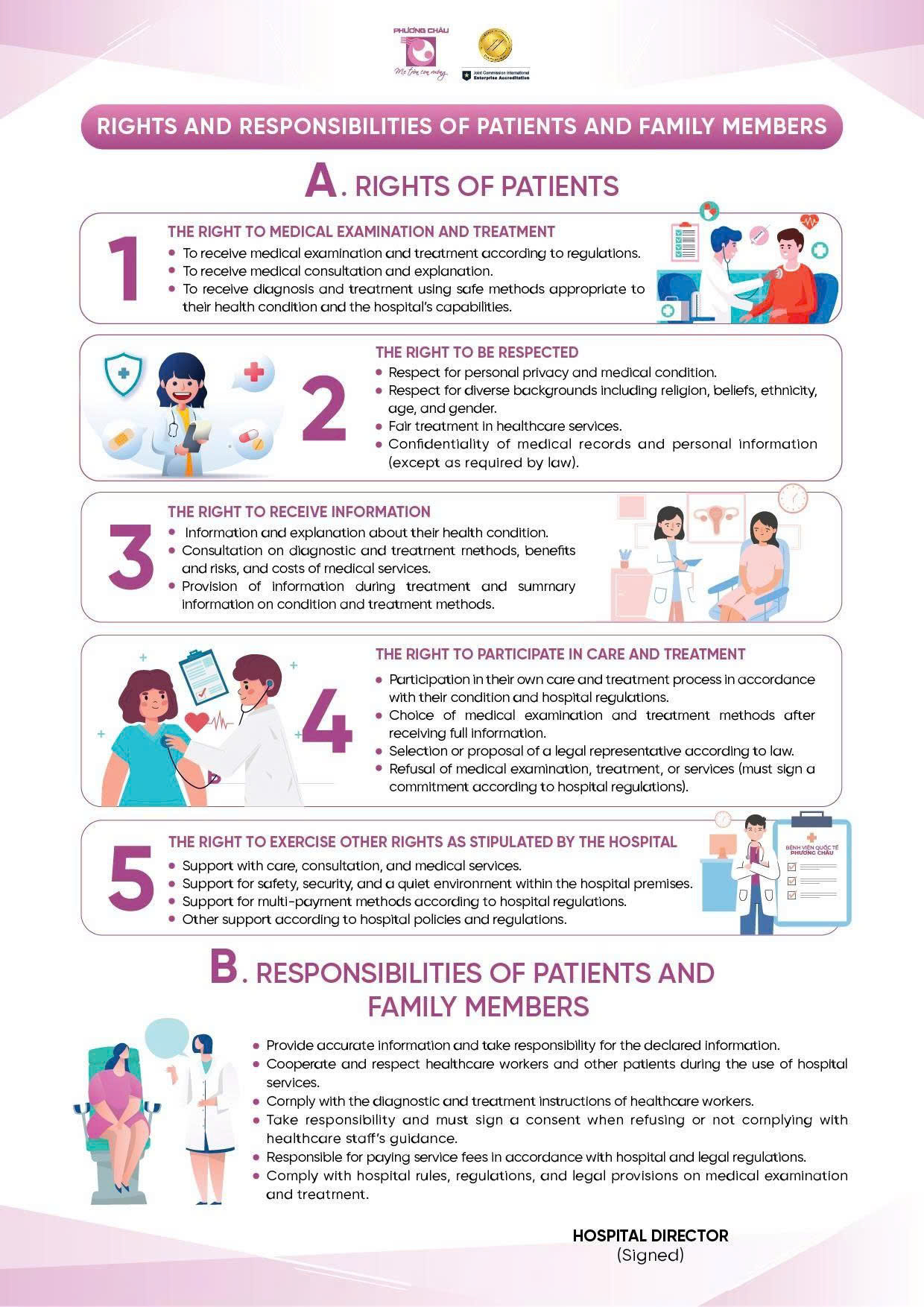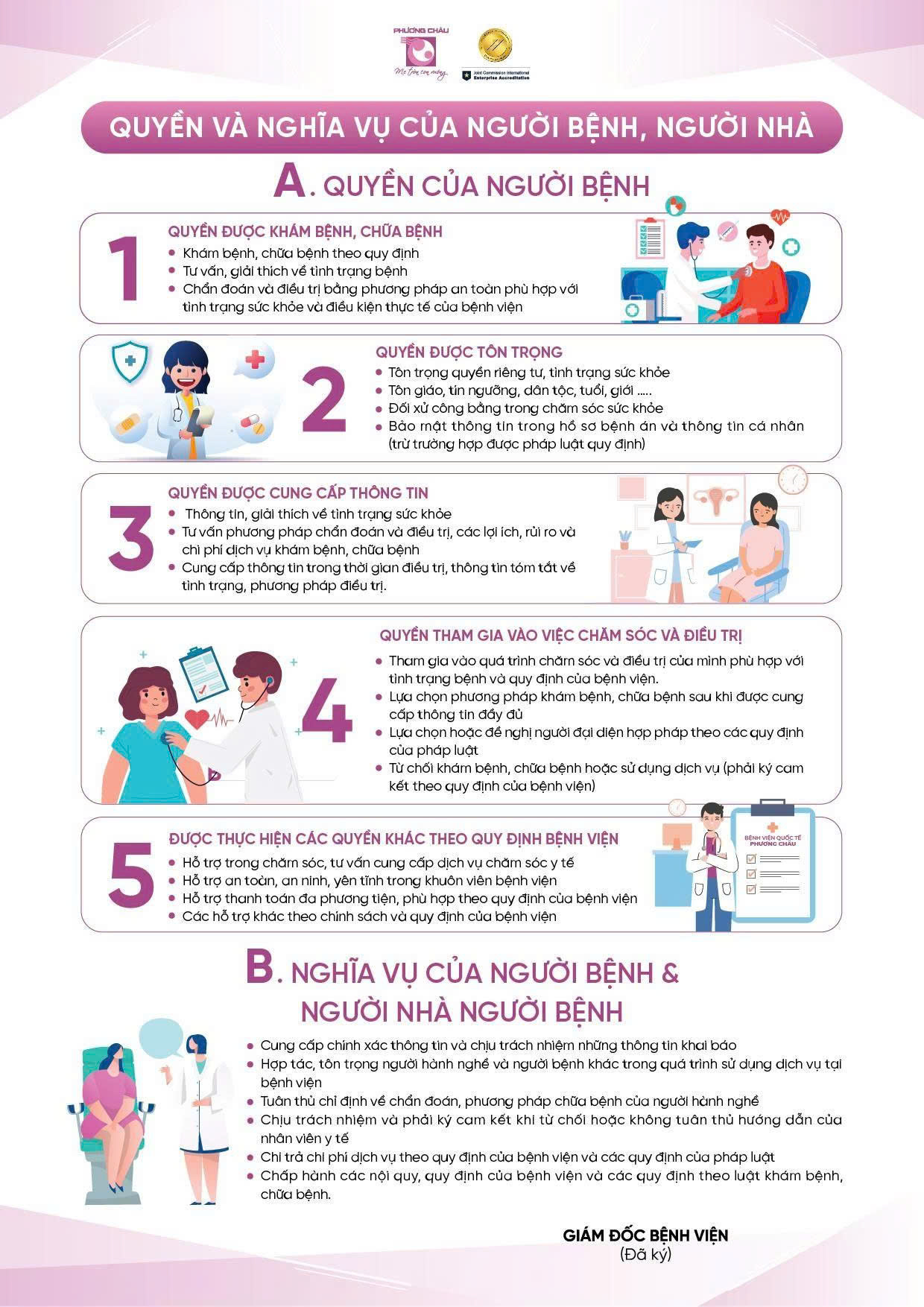 Tại Bệnh viện Quốc tế Phương Châu Sóc Trăng, Quyền và nghĩa vụ của NB được đảm bảo theo tiêu chuẩn JCI (*). Tiêu chuẩn JCI như mắt thần thứ 2 sẽ thay người bệnh giám sát để đảm bảo các quyền này luôn được thực hiện.